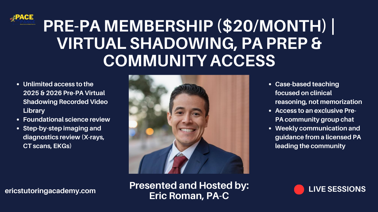 A comprehensive monthly membership for Pre-PA students seeking virtual shadowing, foundational science review, PA school–style didactic content, and community access—all in one growing platform. Includes on-demand videos added monthly, recorded virtual shadowing sessions, CASPA review by PA-Cs, and access to a Pre-PA group chat led by practicing Physician Assistants. Weekly communication and guidance from a licensed PA leading the community. Affordable $20/month membership.